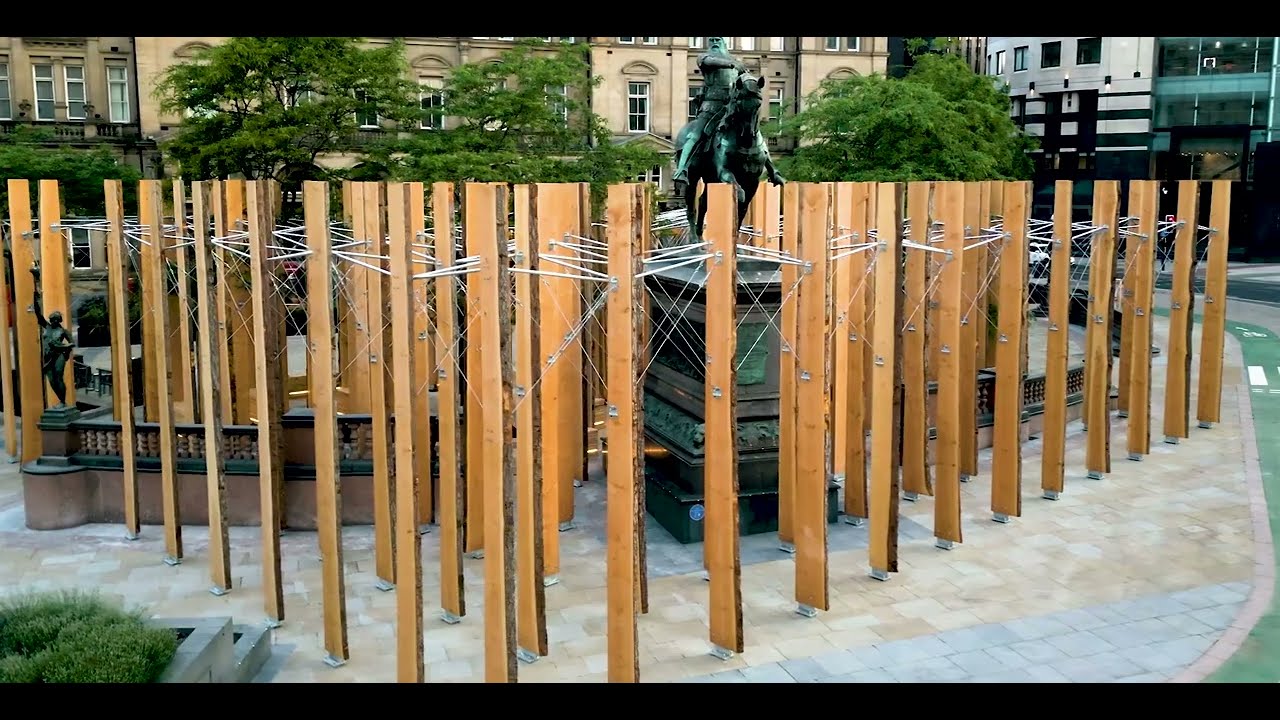 Making a Stand is an installation featuring 127 vertical wooden fins prominently displayed in Leeds City Square. Each fin showcases a unique texture, with one edge retaining its natural bark while the other displays a clean, geometric cut. Arranged in a strict grid, the wooden structure disrupts the square’s regular layout, creating a striking contrast against the existing sculptures, trees, and street furniture, as if it has landed from outer space.