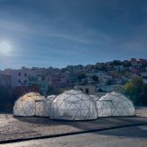 A multi-screen permanent video installation created for Coast Commissions. Students collect video clips of weather conditions from around the world. Once collected, these clips form a database, which is held on a permanently networked server. The software monitors a local weather station through the Internet. As the climate conditions change, the computer plays the relevant video clips on thirty flat screen monitors suspended off the ceiling. The screens show three different versions of the weather conditions; for example, when it is raining the screens show rain from around the world. Most of the screens hang facing downwards forming a cluster (cloud) in the atrium. The software is designed to allow video clips to be easily added year after year, creating a constantly growing weather library.
